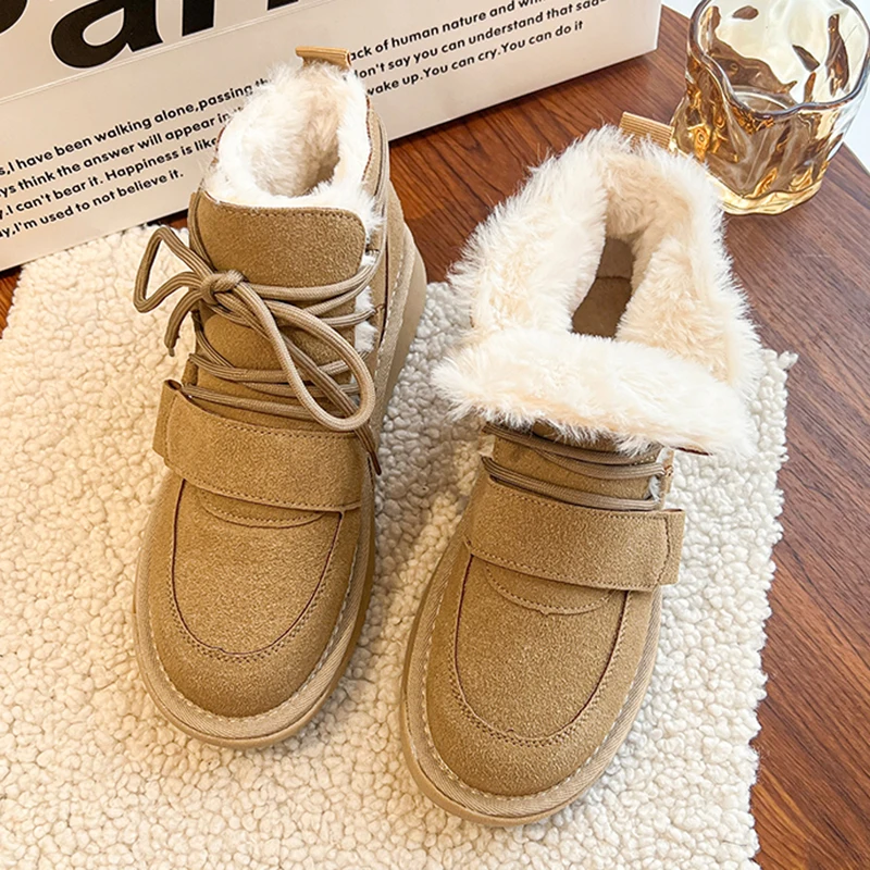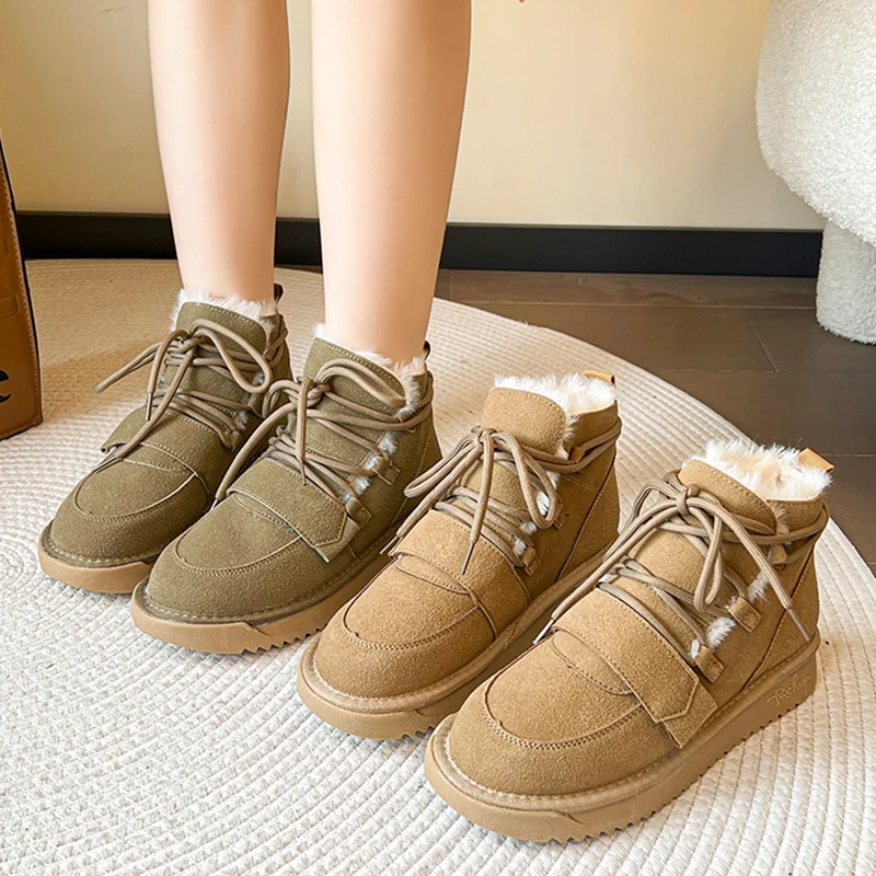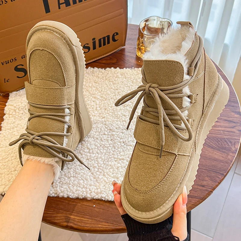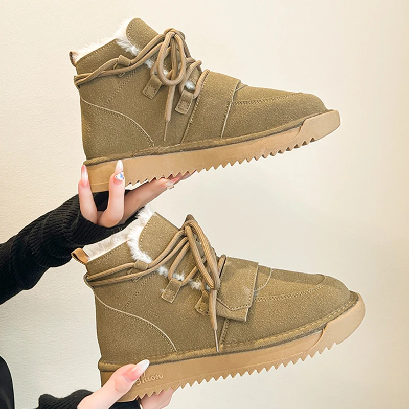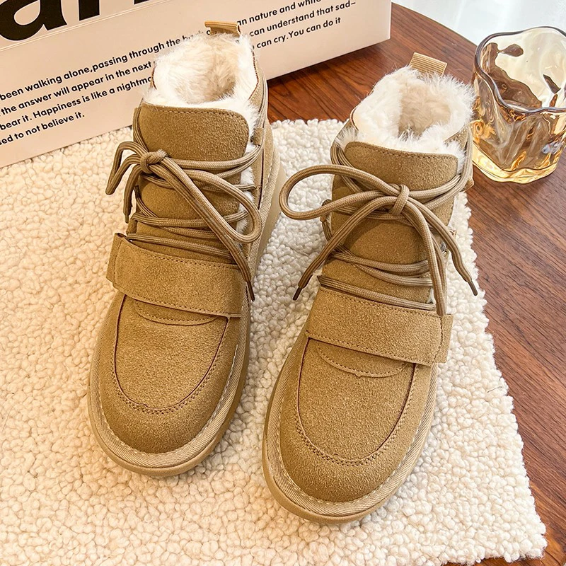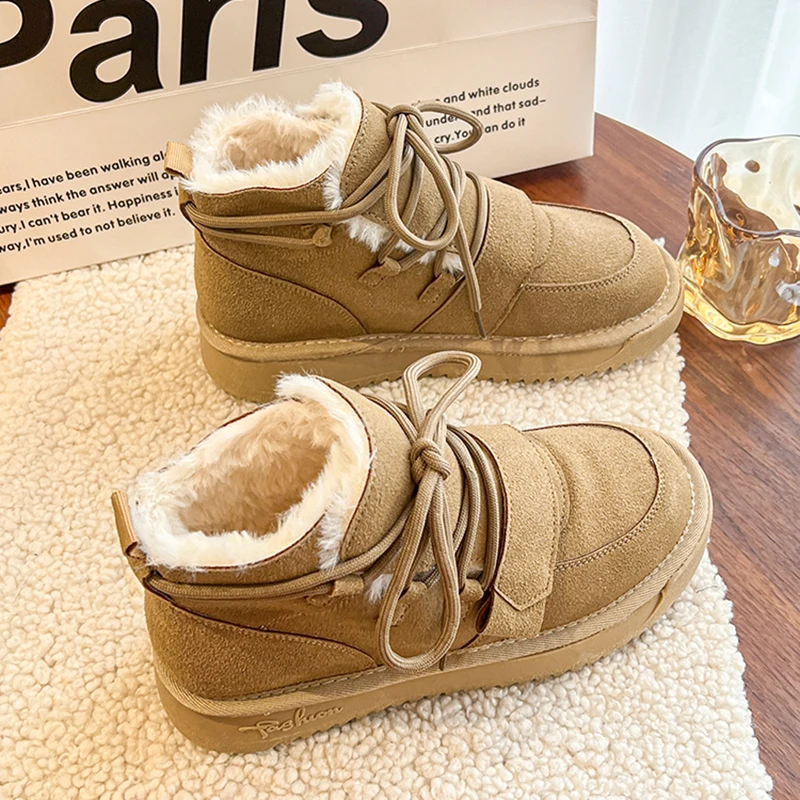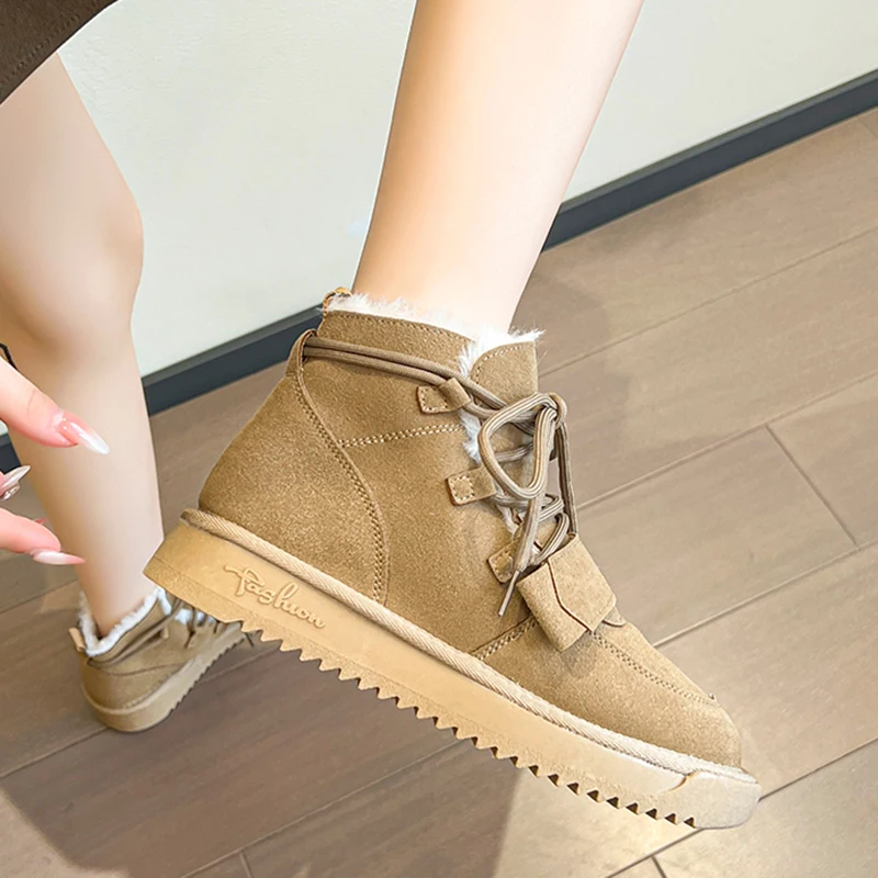 Key selling points: Flat heels for comfortable wear, cotton padding for added warmth, faux suede material for a trendy look, lace up design for a secure fit, ankle length for versatile styling, and plush lining for ultimate comfort.